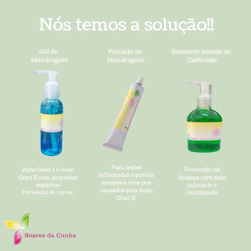 - Pomada de Mandragore: Auxilia em casos de lesões de Acne grau II com inflamação e pontos amarelos com presença de pus.